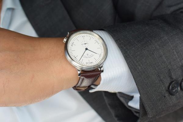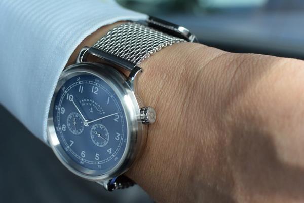 L’affichage des heures en format alphabétique lui donne un look original et décalé, tout comme sa couronne de réglage placée à 4h30.