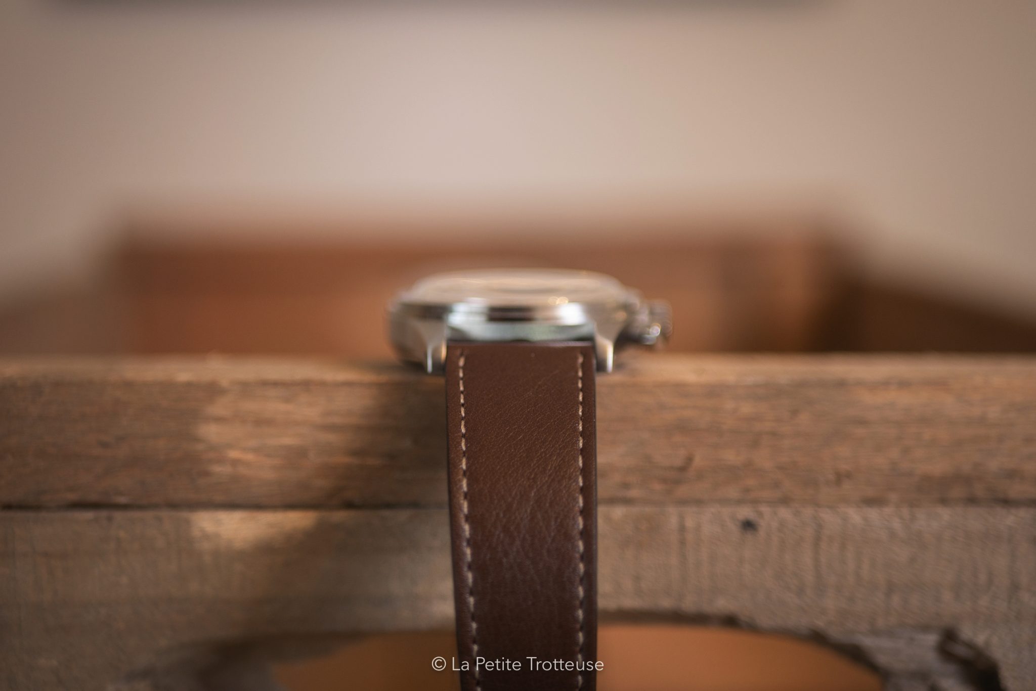 La marque offre 3 coloris pour son bracelet en cuir : lion, tobacco, et noir. Sur ma version, c’est la couleur Tobacco, un marron très profond, et aui ne reflète que très peu la lumière. L’extrémité pointue du bracelet rappelle aussi les anciens bracelets de montres.