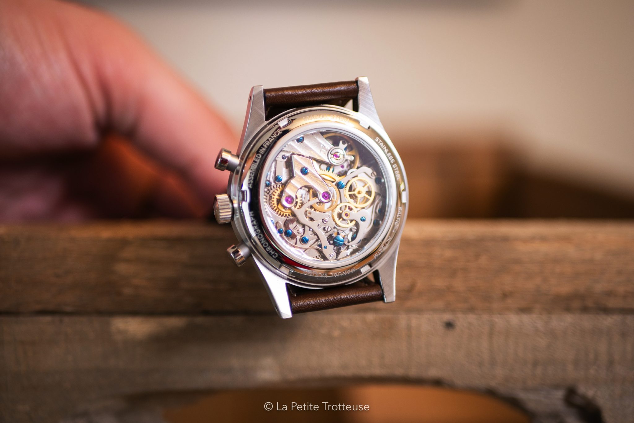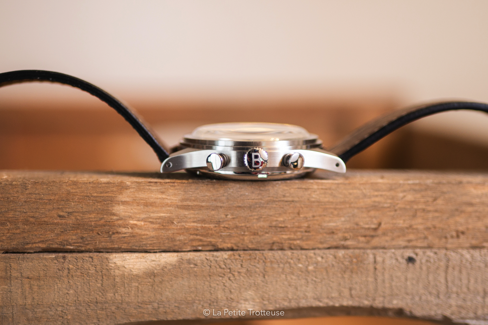 Les boutons du chrono sont de forme « champignon » et sont polis. Leur utilisation est à la fois ferme et qualitative, puisque c’est une montre alimentée par un mécanisme mécanique à remontage manuel (nous revenons dessus quelques paragraphes en dessous).