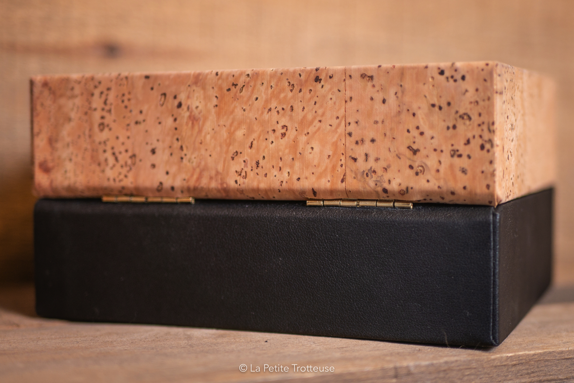 La montre est livrée dans une boite plutôt volumineuse de 17x11x7cm. Cette boite est bicolore, avec une partie haute en liège, et le bas en carton épais noir.