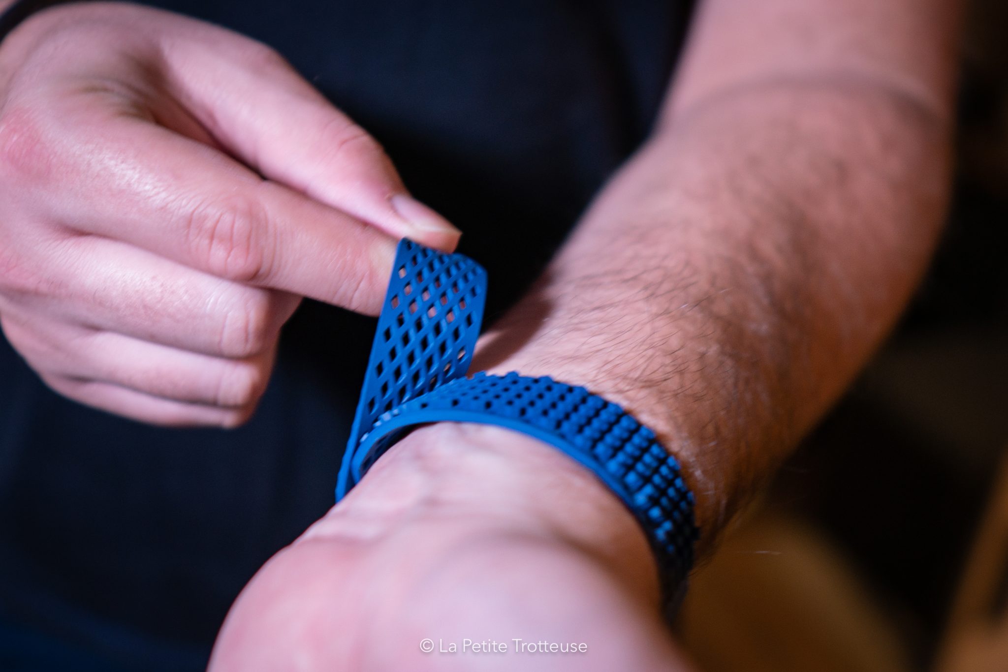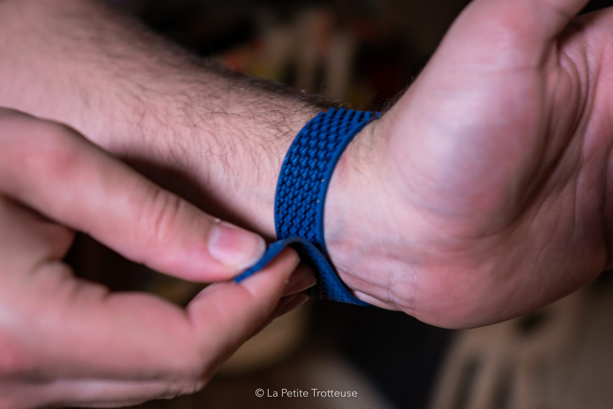Mais l’originalité est bien là quand il s’agit de fermer le bracelet autour du poignet. En effet, et c’est bien tout l’intérêt de ce test, ce bracelet se ferme en s’accrochant sur lui-même.