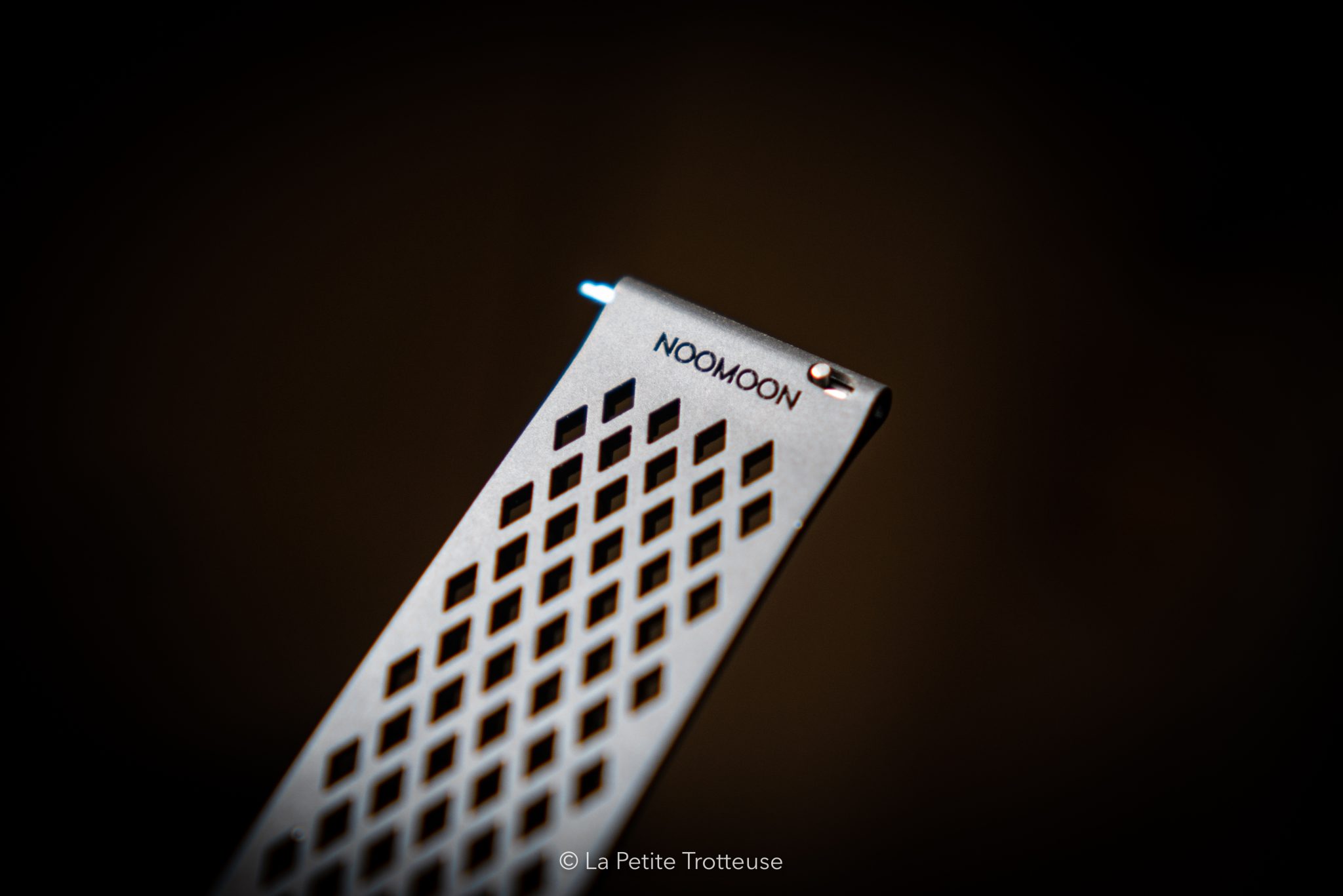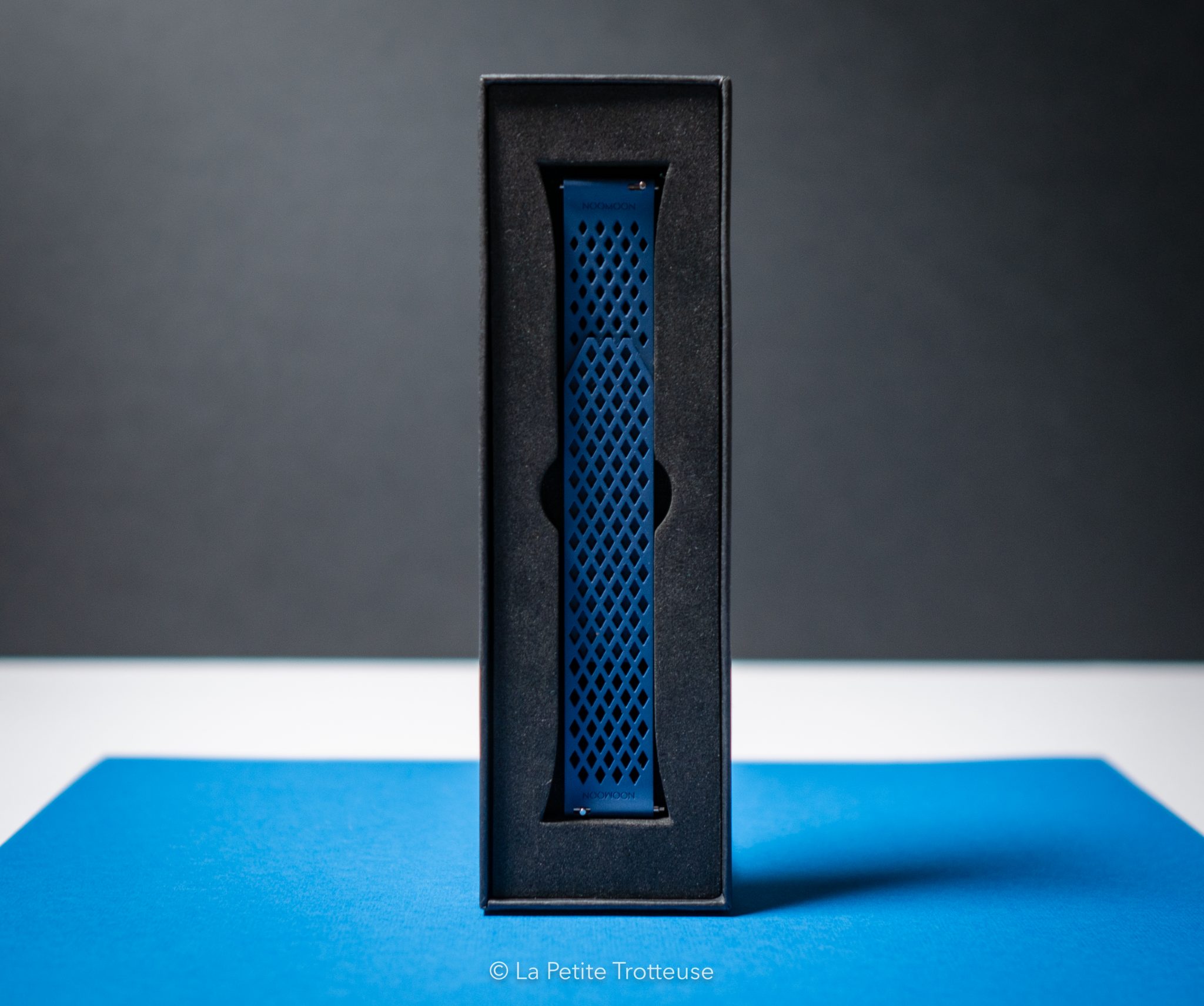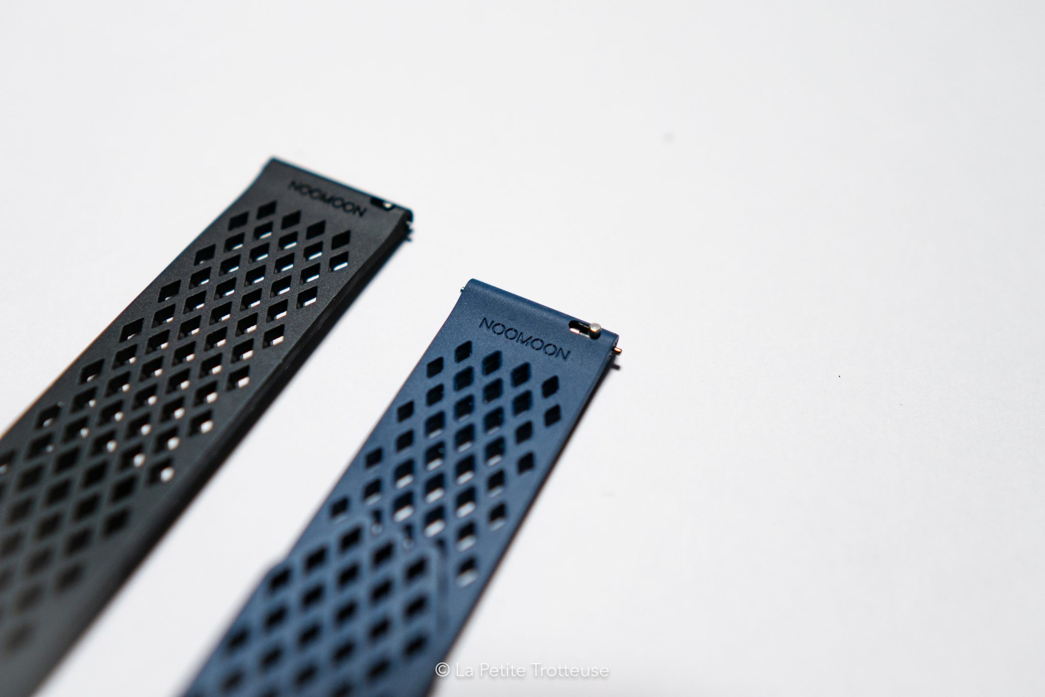 Les deux cotés sont décorés de petits losanges en relief (un côté mâle, un côté femelle). Les découpes sont parfaites, et les finitions vont de même. Une petite gravure du côté inférieur vient rappeler l’identité de la marque, et les pompes d’attache rapide permettront de changer de bracelet à votre guise.